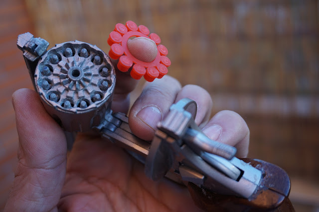 Esta pieza que hoy muestro es un revolver capaz de disparar hasta 12 fulminantes seguidos y forma parte de mi pequeña colección de armas de juguete. Creo que lo tengo desde los primeros años 90 y funciona perfectamente a pesar de haber disparado con el durante al menos dos décadas.
